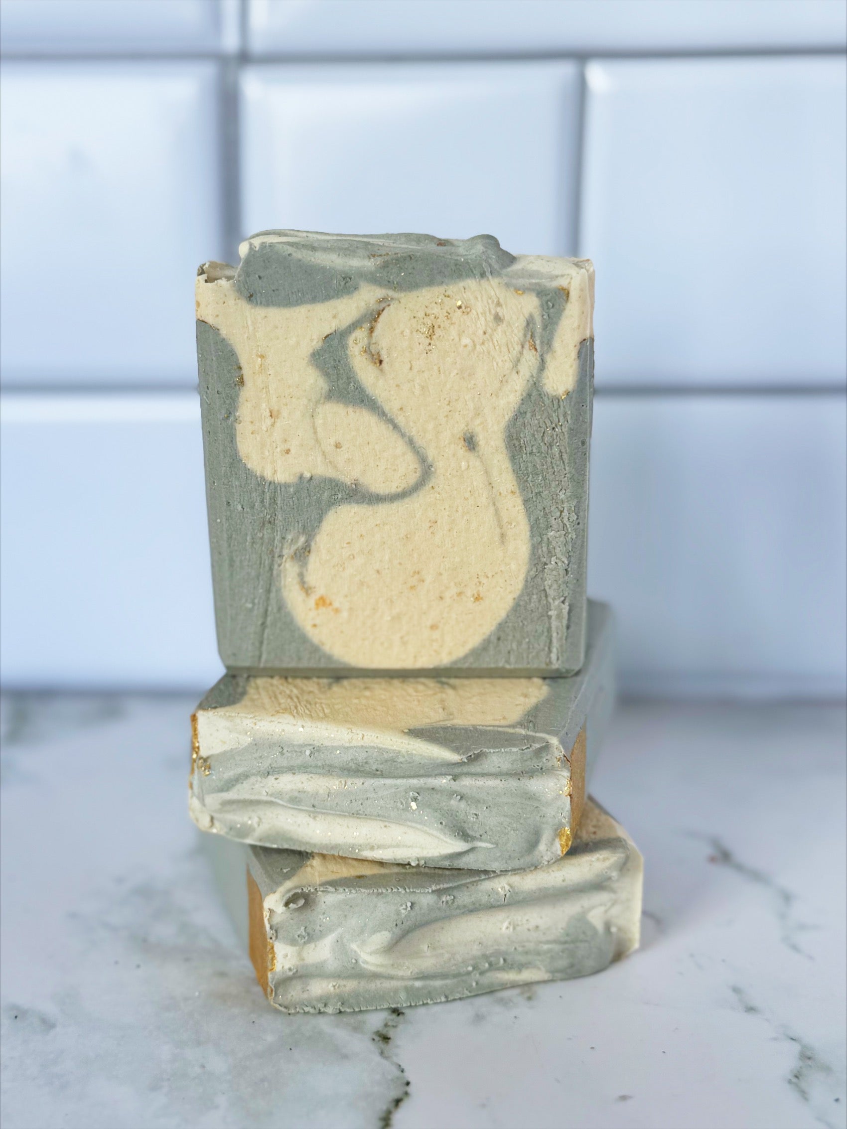 Ingredients: Saponified Oils (Grapeseed, Coconut, Castor), Goat Milk, Tallow, White Kaolin Clay, Mica, Fragrance Oil.